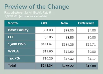 Beginning with bills received on or after June 1, residential accounts will see a 7% adjustment to the kWh energy rate and a $4 adjustment to the basic facility charge, changing from $34.00 to $38.00 per month. The exact impact on each bill will vary based on individual energy use.